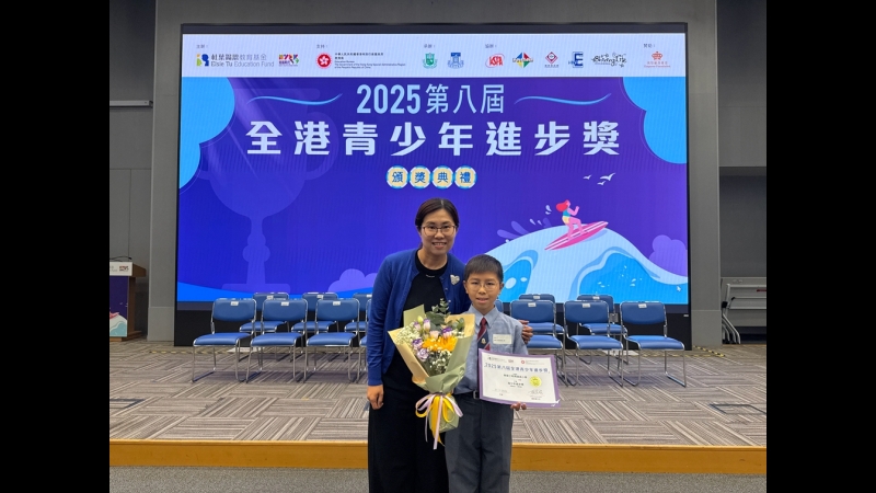 為表揚積極向上、追求卓越的學生,杜葉錫恩教育基金每年都會舉辦「全港青少年進步獎」。「全港青少年進步獎」參與的同學需要經過多重篩選,能夠代表學校參與的都是表現突出,勇於面對挑戰,追求卓越的學生。本校陳同學很榮幸得到基金會的認同及肯定,從數千人中脫穎而出,於「2025第八屆全港青少年進步獎」中取得「全港青少年進步獎」,恭喜陳同學!