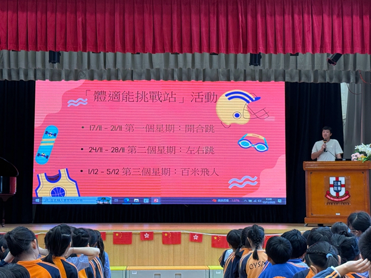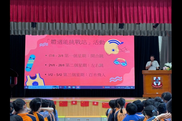 為了讓同學明白「知而行」的重要性,培養他們每天做運動的習慣。本校特於17/11-12/12期間進行了「體適能挑戰站」活動,分別進行了「開合跳」、「左右跳」及「百米飛人」三個項目,每個項目均會選出每級最好表現的2位同學及全校最積極參與的班別,以作表揚及欣賞。活動期間,看見同學積極參與,參與人數不斷增加,目標可期,期盼活動過後,同學們繼續努力,堅持每天做運動的好習慣。