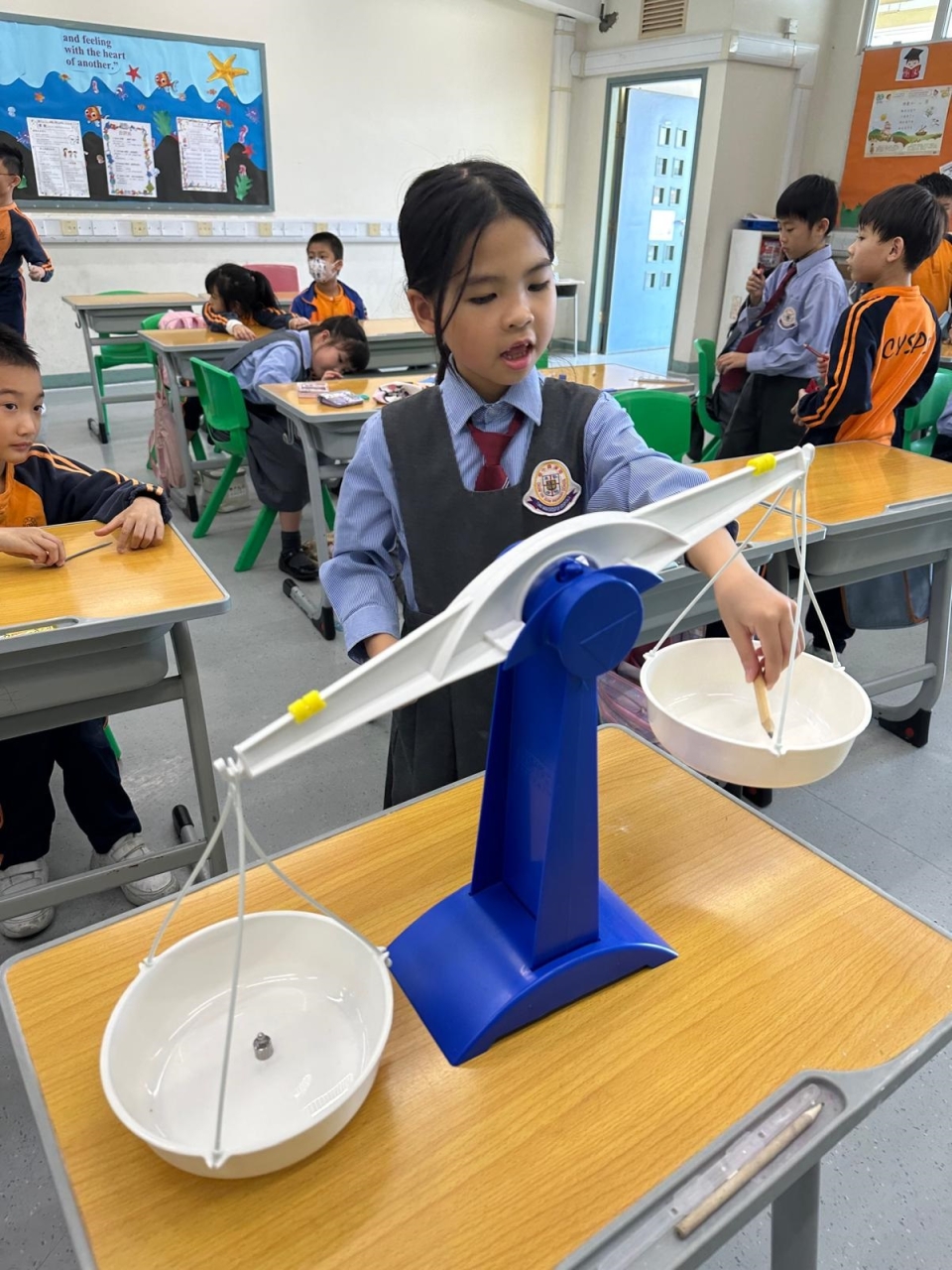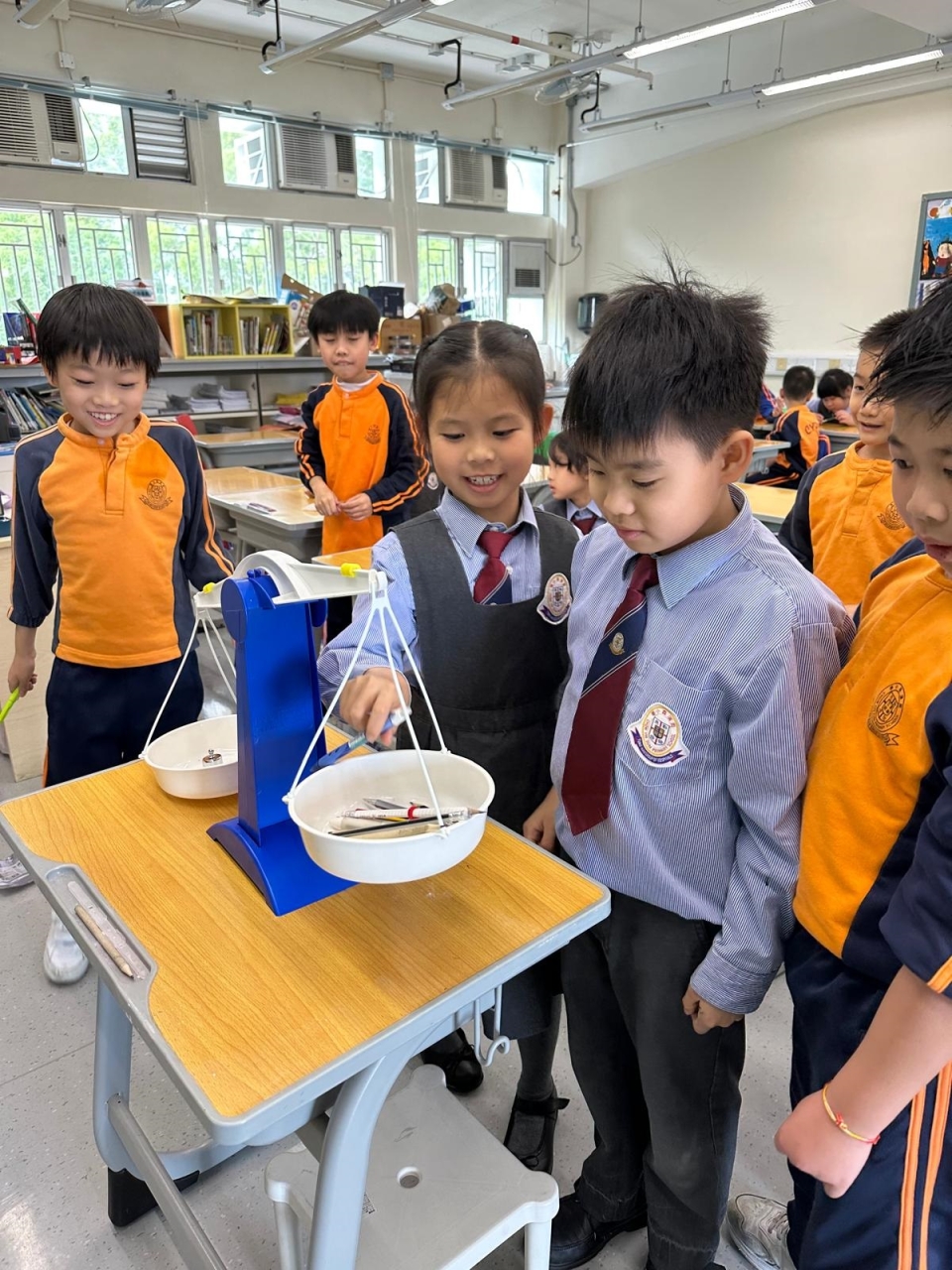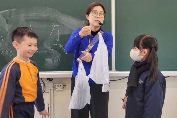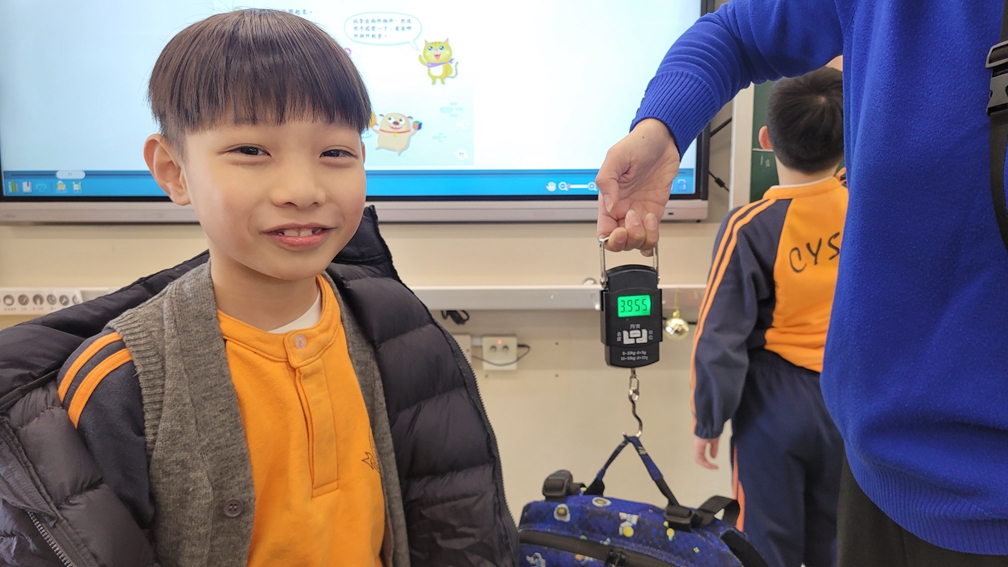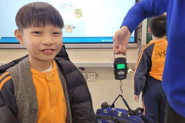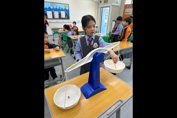 三年級數學老師在教授「重量的認識」課題時,為同學安排不同類型的教學活動。同學們正在課堂上使用自製天平、天平及座枱磅測量不同物品的重量。他們神情專注,互相討論,顯示出對學習的熱情,展現了學生透過實際操作來探索數學概念的良好學習經驗。