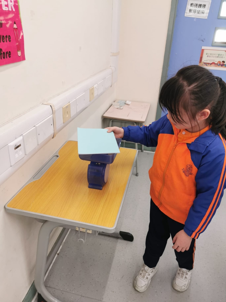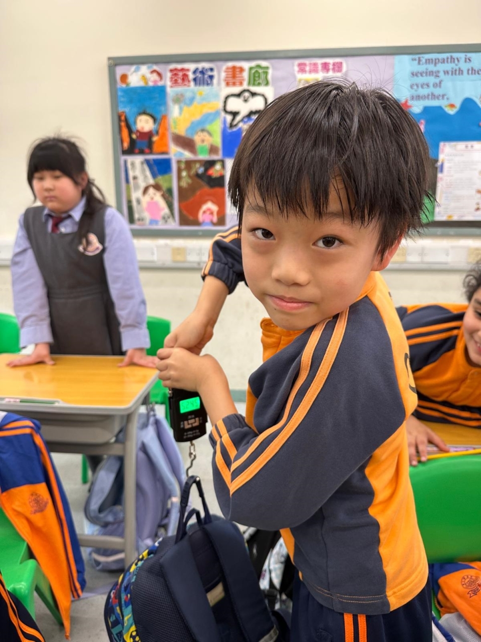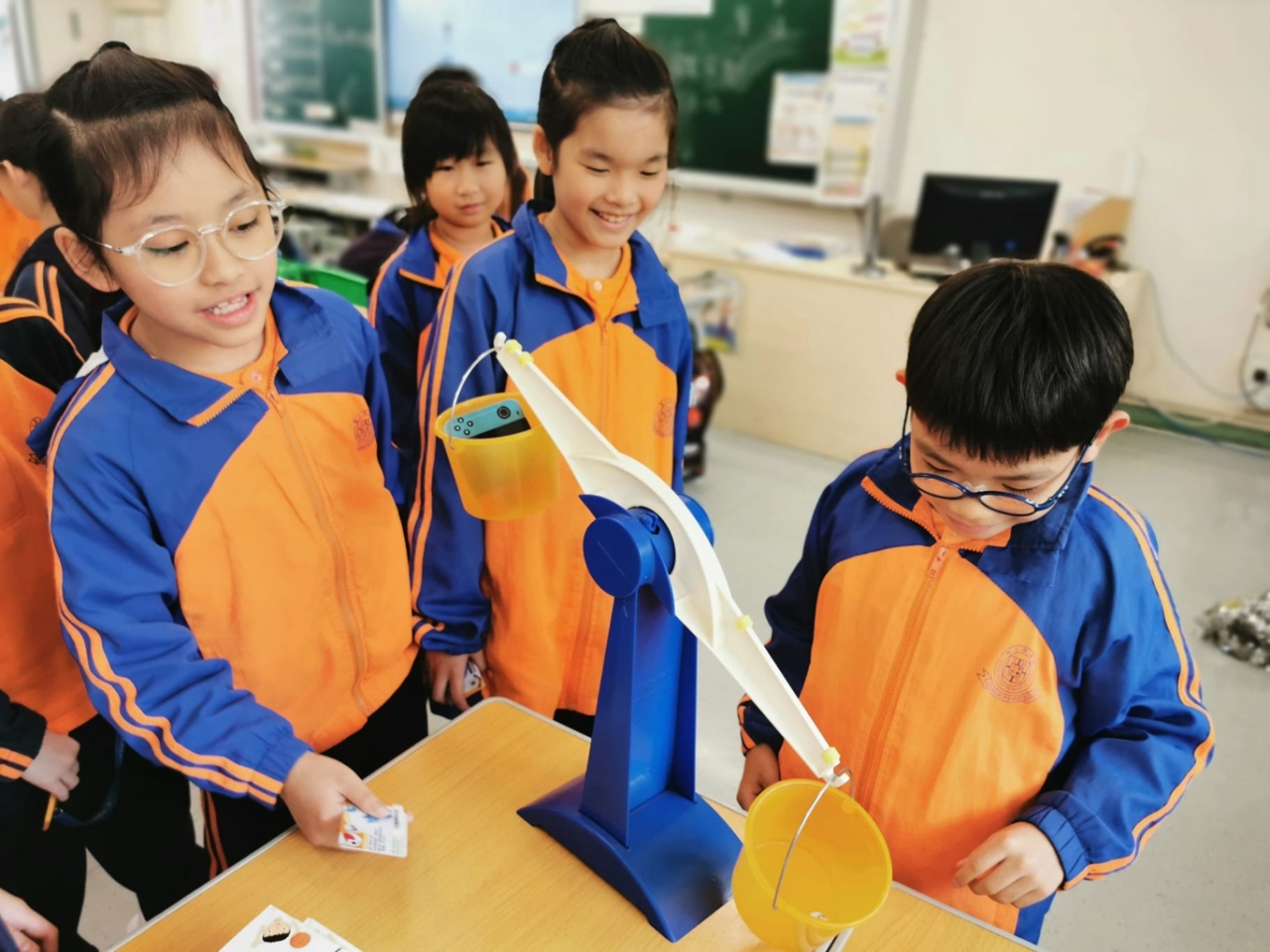 三年級數學老師在教授「重量的認識」課題時,為同學安排不同類型的教學活動。同學們正在課堂上使用自製天平、天平及座枱磅測量不同物品的重量。他們神情專注,互相討論,顯示出對學習的熱情,展現了學生透過實際操作來探索數學概念的良好學習經驗。