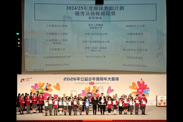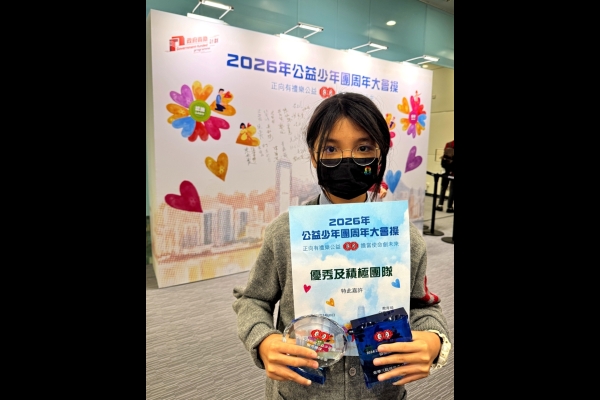 「公益少年團2026年周年大會操」已於1月30日假伊利沙伯體育館順利舉行,這是一年一度的公益少年團盛事,亦是全港十八分區公益少年團團員共聚一堂的日子。在本校學生和家長的共同努力下,本校在公益少年團周年大會操2026榮獲「積極團隊獎」及「優秀團隊獎」,藉以表揚本校積極參加教育局公益少年團的中央和區本活動,並由六年級曾同學代表學校上台領獎。本校將會繼續努力培育學生的公民責任感、領導能力和團隊合作精神,讓他們積極參與社區事務,建立良好品格,今後為社會作出貢獻。