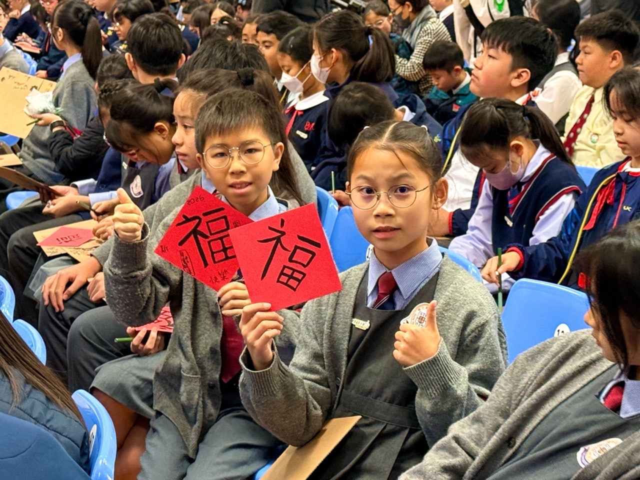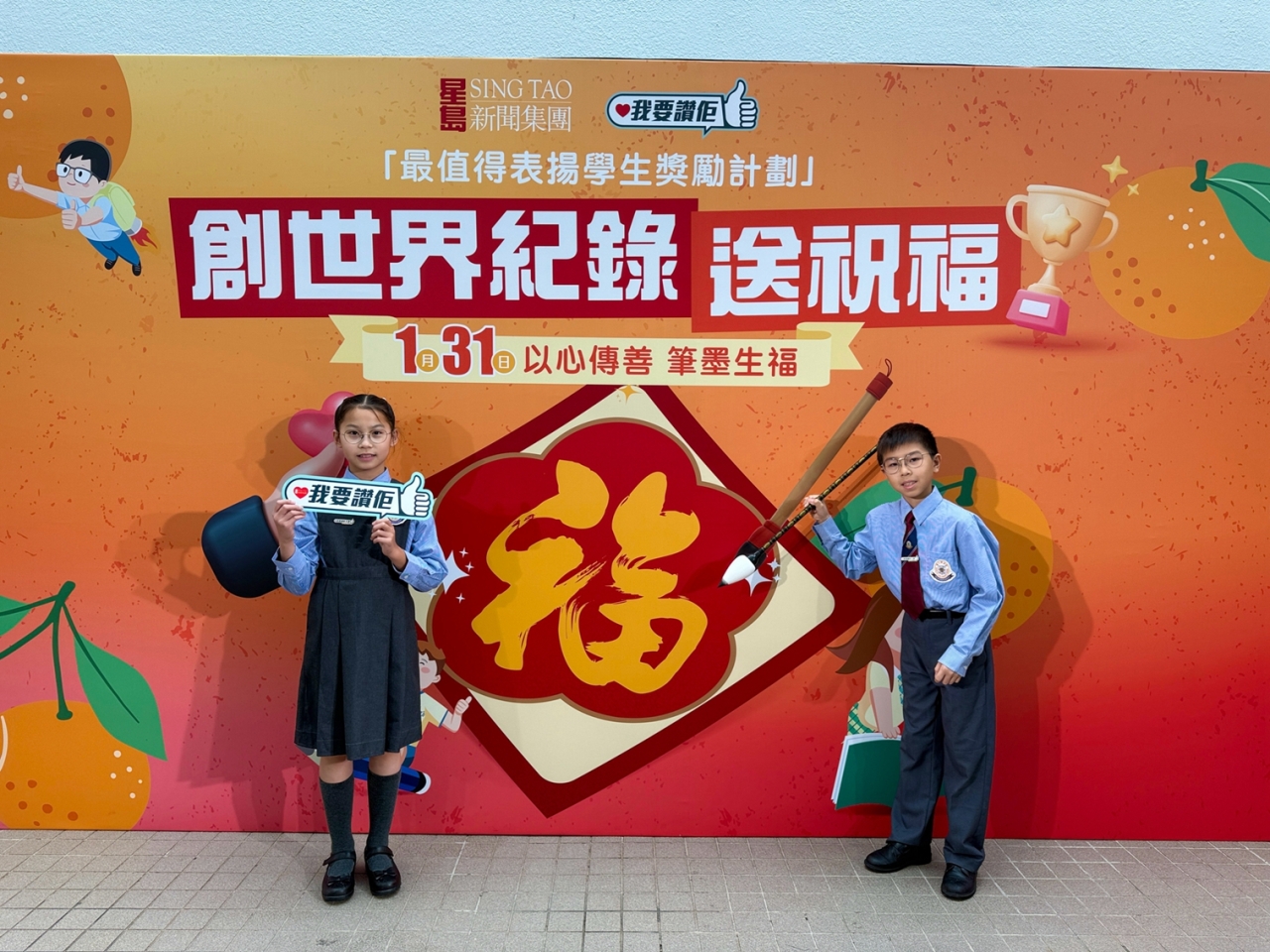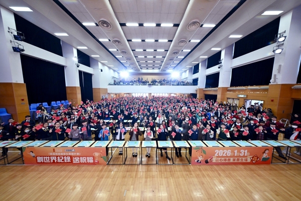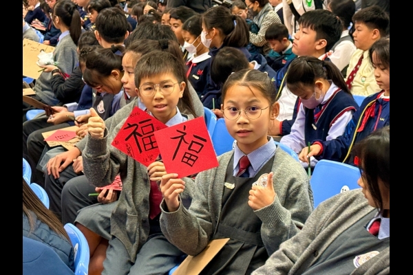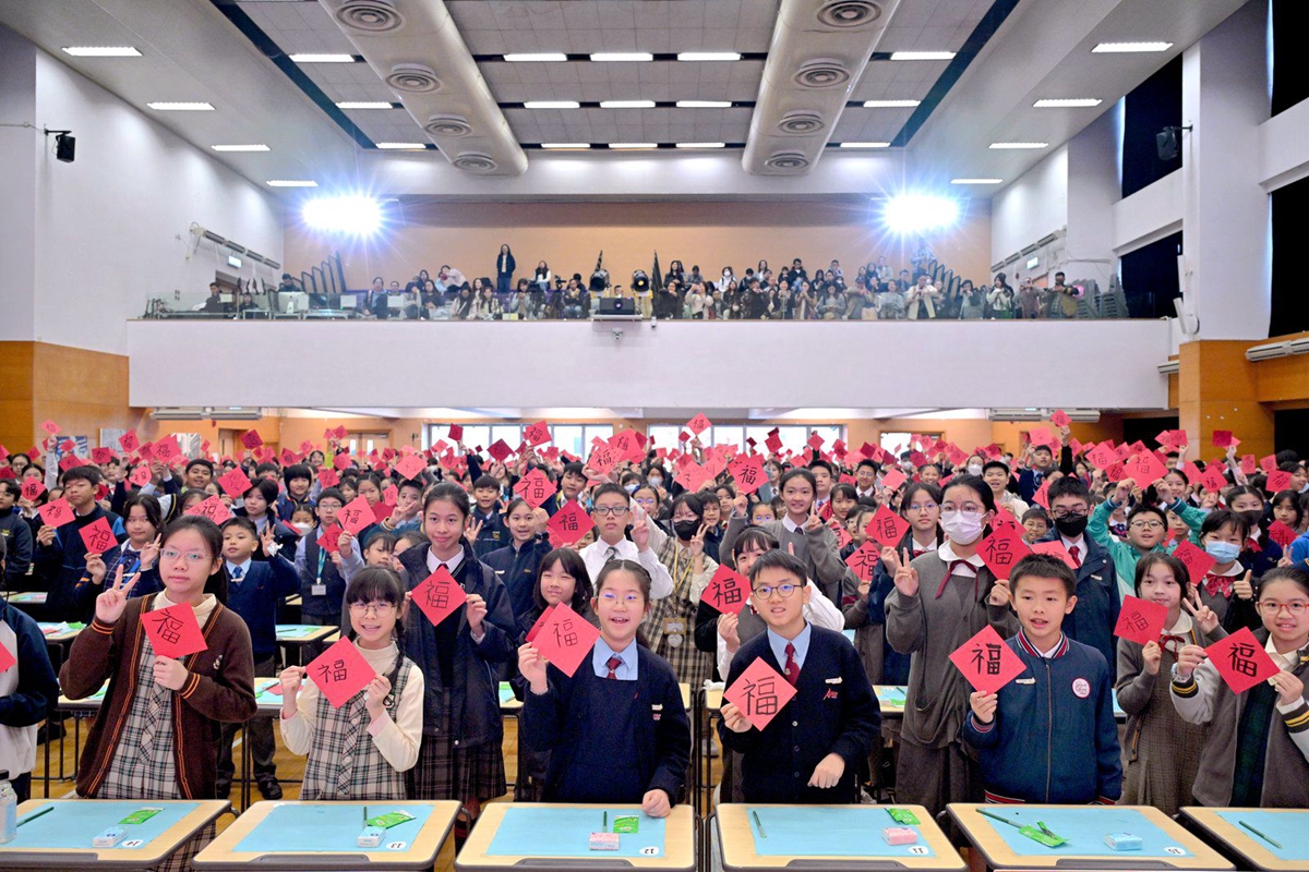 當日,楊副校長帶領兩位學生大使參加大會的「以心傳善 筆墨生福 共創世界紀錄 」活動,共同以書法筆書寫「福」字,攜手挑戰共創世界紀錄,並趁農曆新年來臨之際向大家傳遞祝福,與在場一眾嘉賓一起發揮暖暖的正能量!