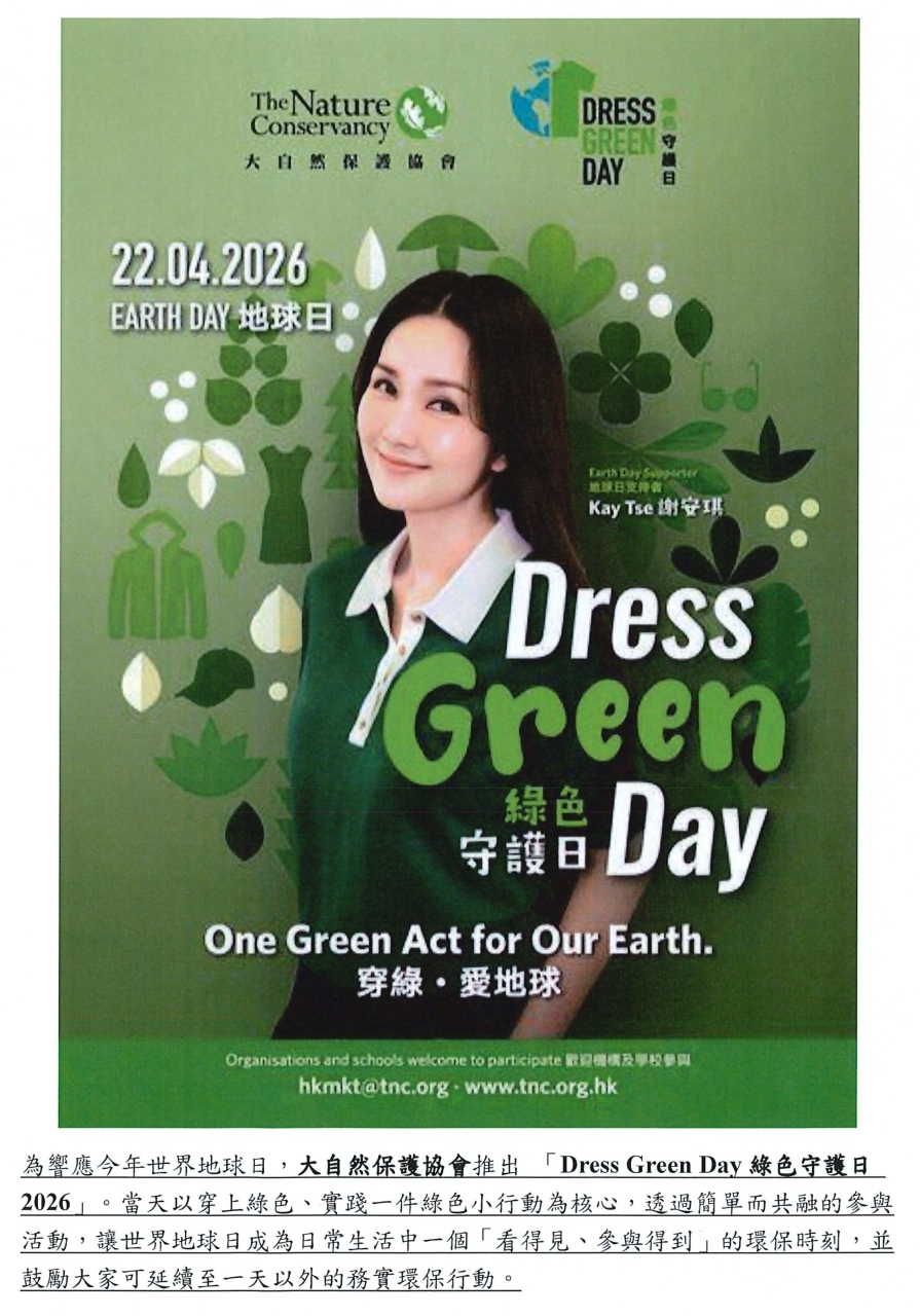 為響應今年世界地球日,大自然保護協會推出 「Dress Green Day綠色守護日 2026」。當天以穿上綠色、實踐一件綠色小行動為核心,透過簡單而共融的參與活動,讓世界地球日成為日常生活中一個「看得見、參與得到」的環保時刻,並鼓勵大家可延續至一天以外的務實環保行動。