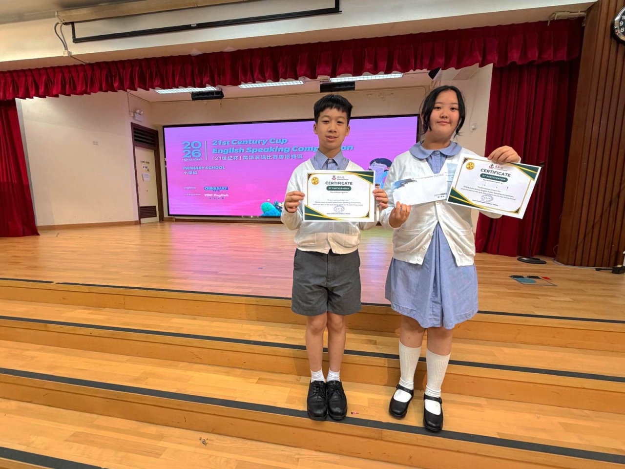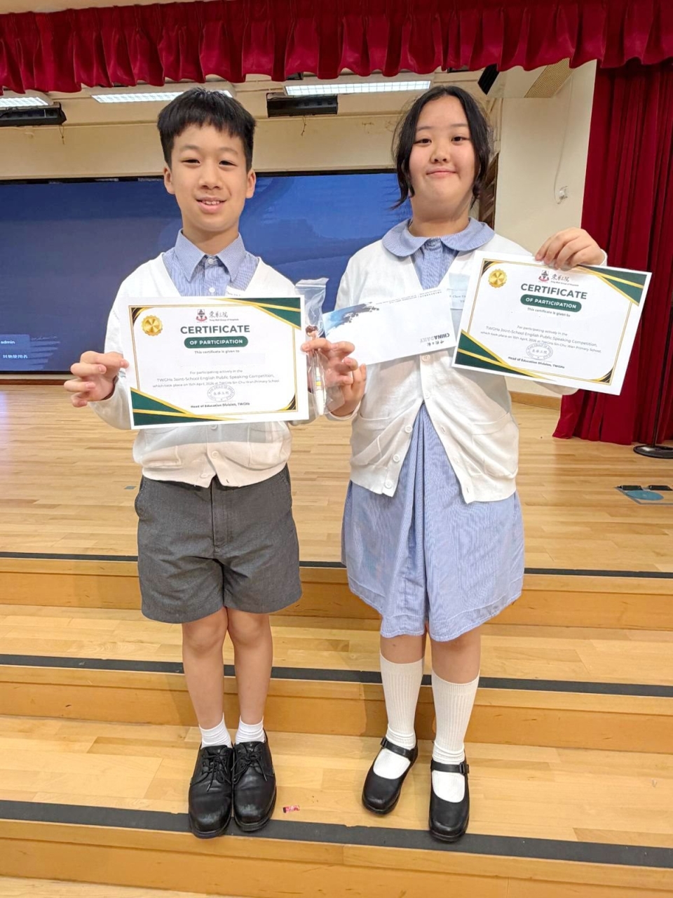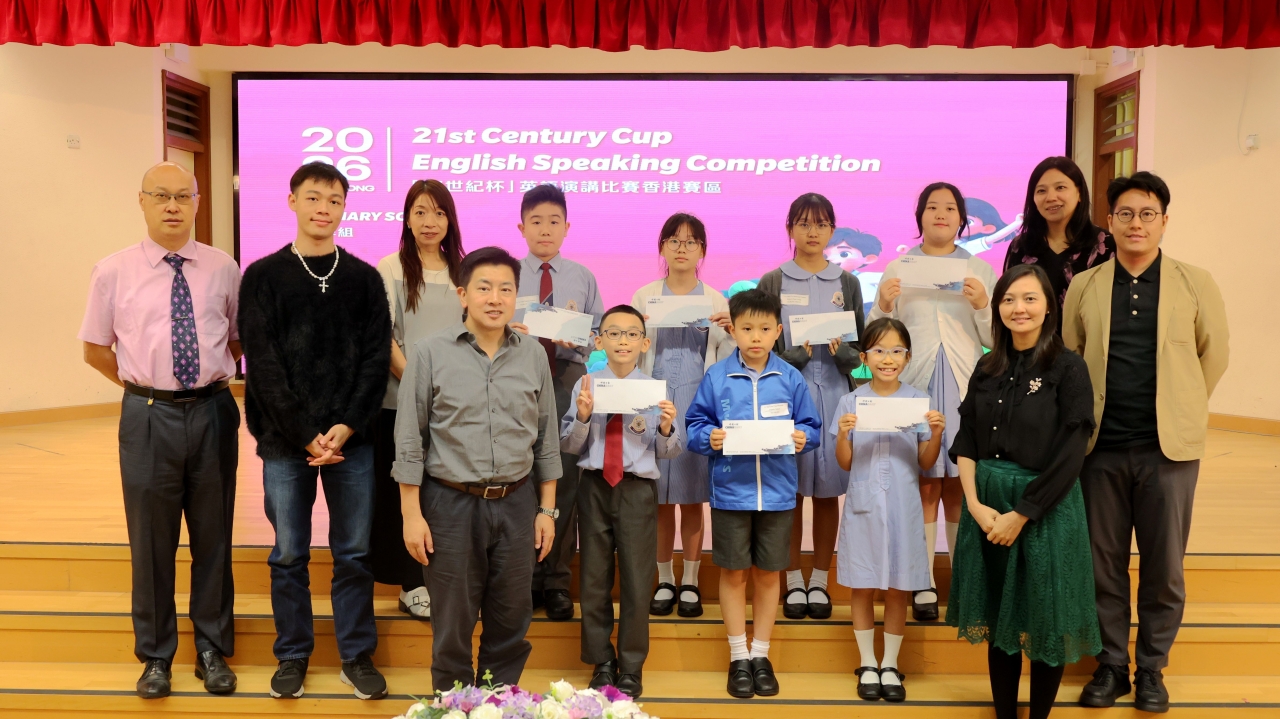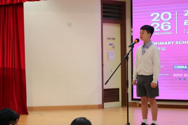 為使同學有更多比賽的經驗及互相觀摩學習的機會,東華三院小學舉行了聯校英語演講比賽,當天,8位四至六年級同學連同2位參賽同學一同前往東華三院冼次雲小學出席比賽。最後,六年級的易同學脫穎而出,並獲得「21世紀杯」全國英語演講比賽的初賽資格。恭喜!恭喜!