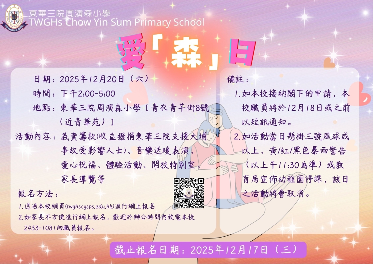 本校東華三院周演森小學原定於2025年12月20日(星期六)舉辦【繽紛演森嘉年華暨服務學習日】,鑑於早前大埔宏福苑發生嚴重火災,造成多人傷亡及無數家庭失去家園。本校為了表達對受影響居民的深切關懷與尊重,決定調整當日活動內容,轉而以認識本校與傳遞祝福為主題,歡迎貴家長及子女一同參與,屆時本校將舉辦義賣籌款(收益撥捐東華三院支援大埔事故受影響人士)、音樂送暖表演、愛心祝福、體驗活動、愛心祝福及開放校園供來賓參觀,有興趣參加的家長請於網上或電話報名。
