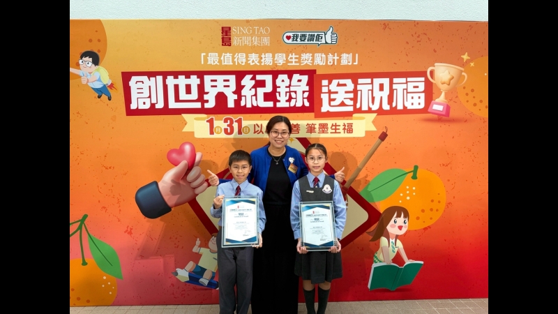 喜訊!!!在星島新聞集團舉辦《我要讚佢》的「最值得表揚學生獎勵計劃」中,我校兩位陳同學獲選成為「我要讚佢學生大使」,其良好的價值觀和態度得到大會的表揚和肯定。當日,楊副校長帶領兩位學生大使參加大會的「以心傳善 筆墨生福 共創世界紀錄 」活動,共同以書法筆書寫「福」字,攜手挑戰共創世界紀錄,並趁農曆新年來臨之際向大家傳遞祝福,與在場一眾嘉賓一起發揮暖暖的正能量! 睇片!
