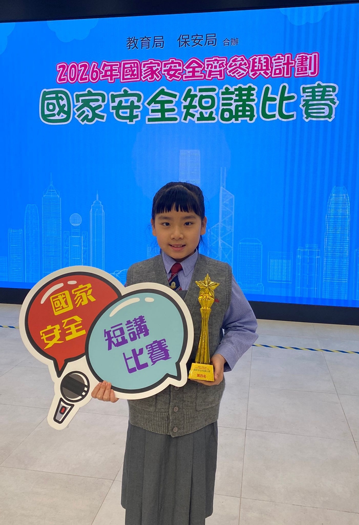 早前,學校收到不少同學提交「國家安全短講比賽」的作品。經過老師挑選,最後將三份佳作呈交教育局參加「2026年國家安全齊參與」計劃的「國家安全短講比賽」。當中四年級陳同學以「文字的安全密碼」為題的作品獲選為首五名佳作,並獲邀參加現場決賽。陳同學現場表現優秀,最後獲得第四名的佳績!恭喜陳同學!