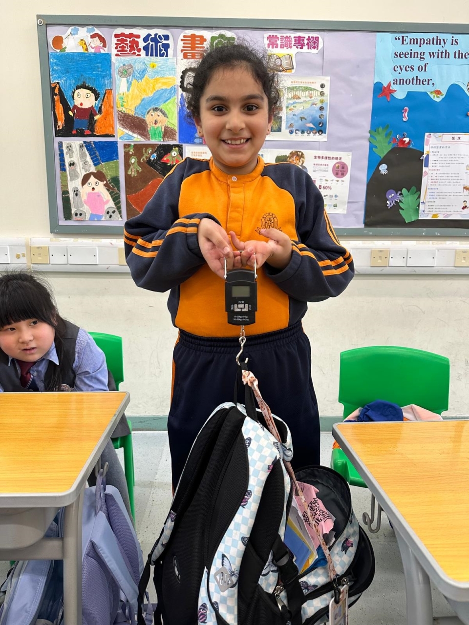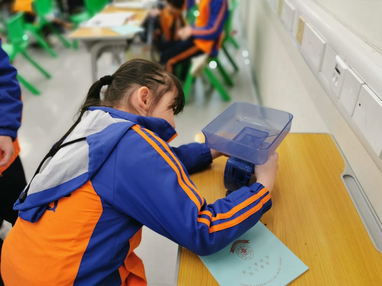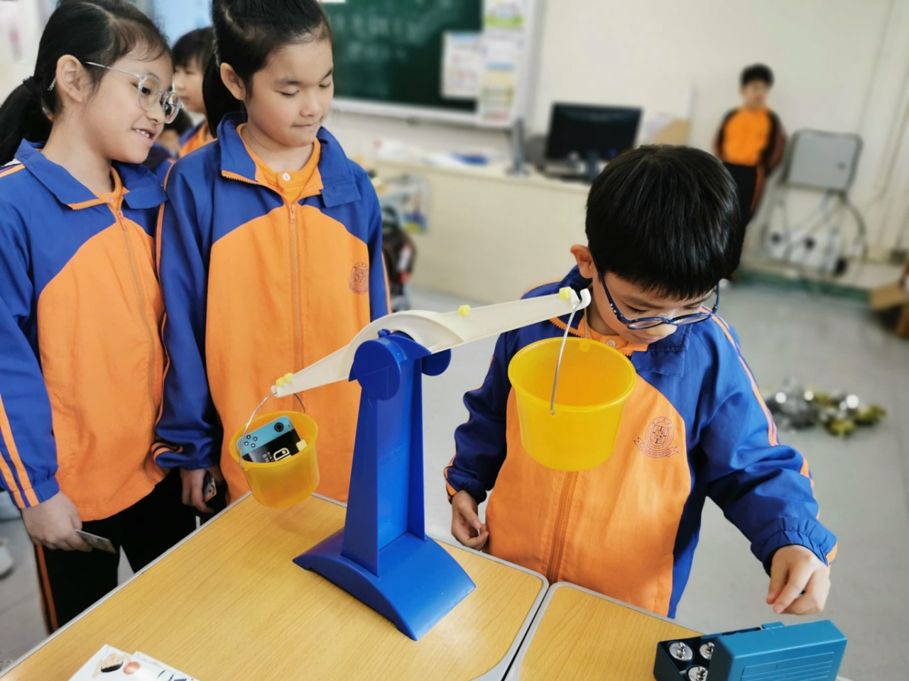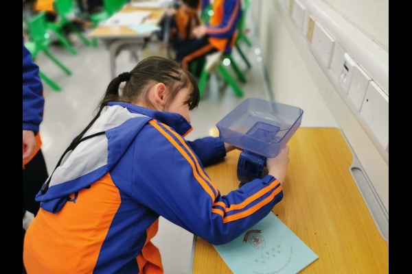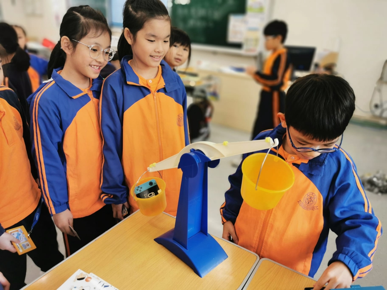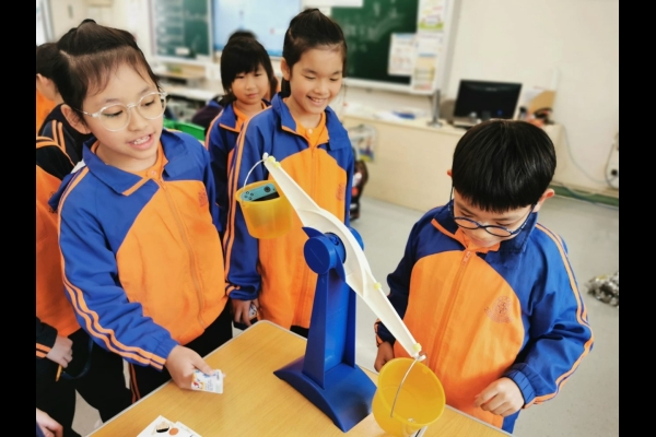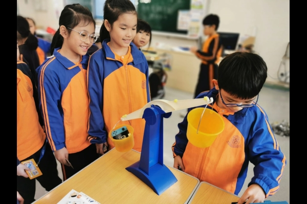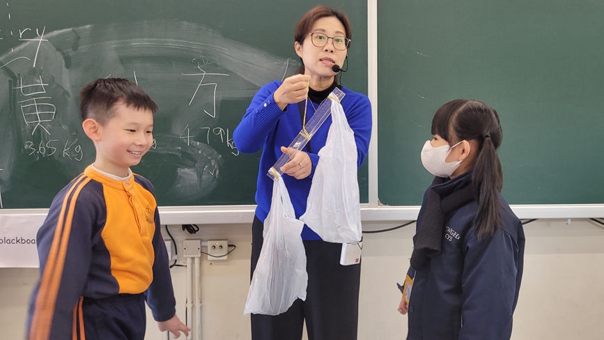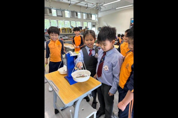 三年級數學老師在教授「重量的認識」課題時,為同學安排不同類型的教學活動。同學們正在課堂上使用自製天平、天平及座枱磅測量不同物品的重量。他們神情專注,互相討論,顯示出對學習的熱情,展現了學生透過實際操作來探索數學概念的良好學習經驗。