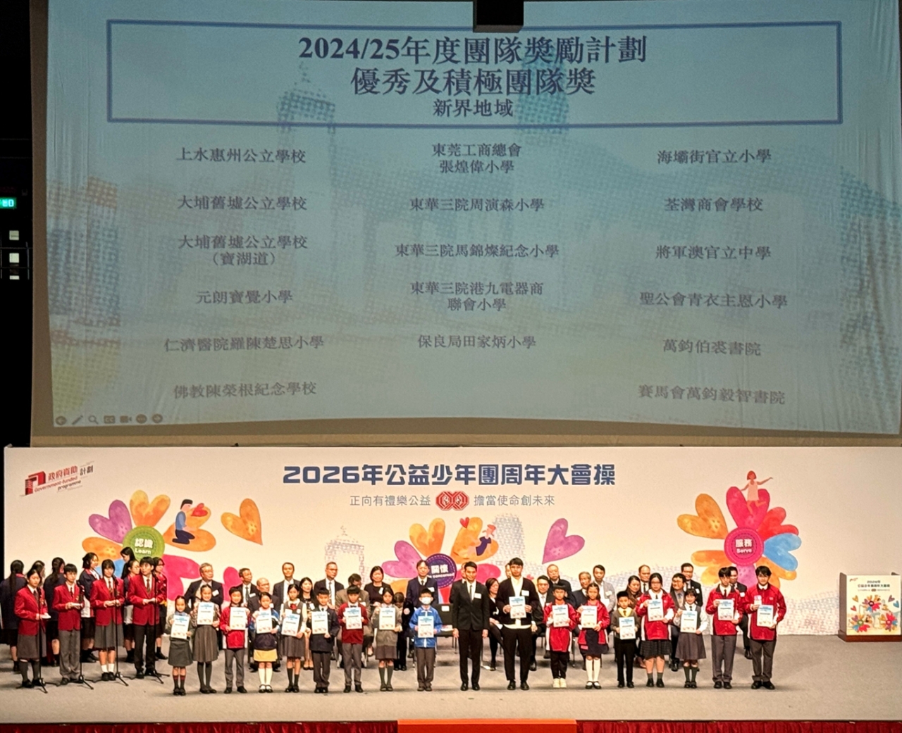「公益少年團2026年周年大會操」已於1月30日假伊利沙伯體育館順利舉行,這是一年一度的公益少年團盛事,亦是全港十八分區公益少年團團員共聚一堂的日子。在本校學生和家長的共同努力下,本校在公益少年團周年大會操2026榮獲「積極團隊獎」及「優秀團隊獎」,藉以表揚本校積極參加教育局公益少年團的中央和區本活動,並由六年級曾同學代表學校上台領獎。本校將會繼續努力培育學生的公民責任感、領導能力和團隊合作精神,讓他們積極參與社區事務,建立良好品格,今後為社會作出貢獻。