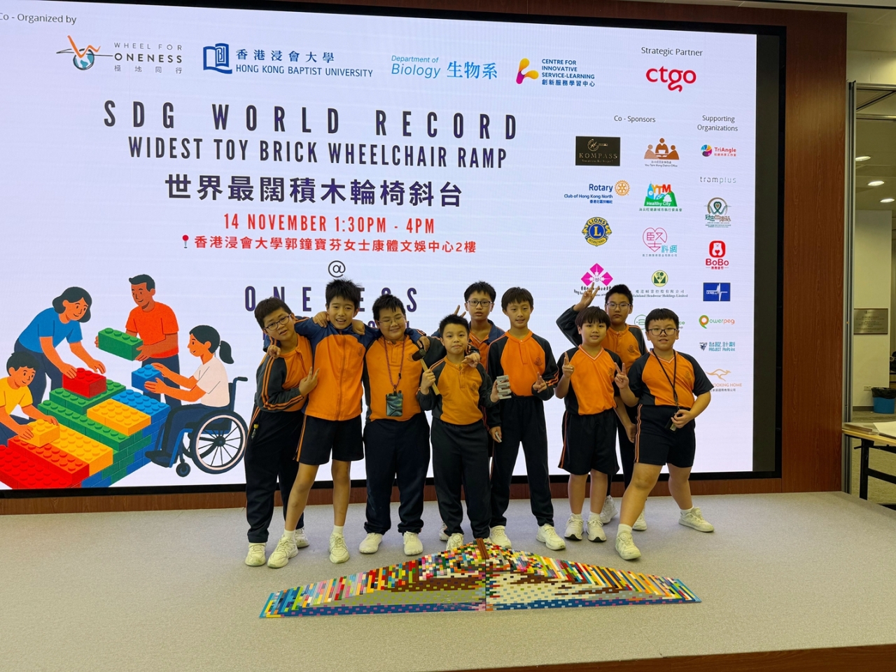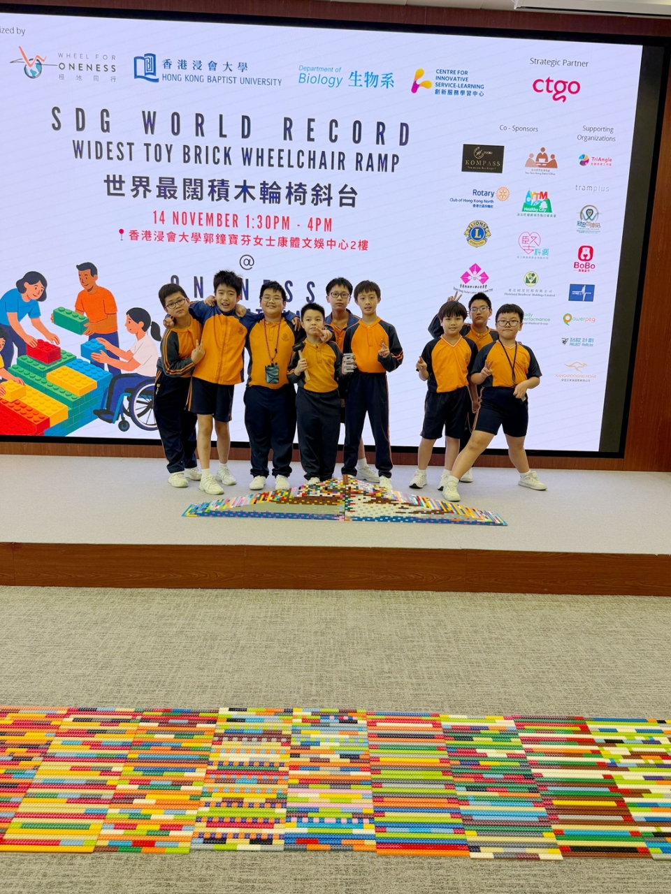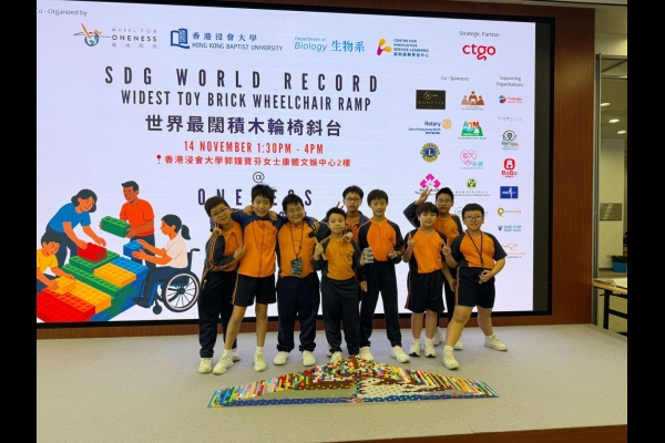 本校有十位六年級男同學,參加由極地同行(Wheel for Oneness)所舉辦之「積木輪椅斜台大挑戰」活動,有關活動舉行的目的,是讓學生了解輪椅人士的需要,從而提升同學之同理心。參加者在參與有關活動的過程中,成功合力製作出世界最闊之輪椅斜台,打破世界紀錄。
